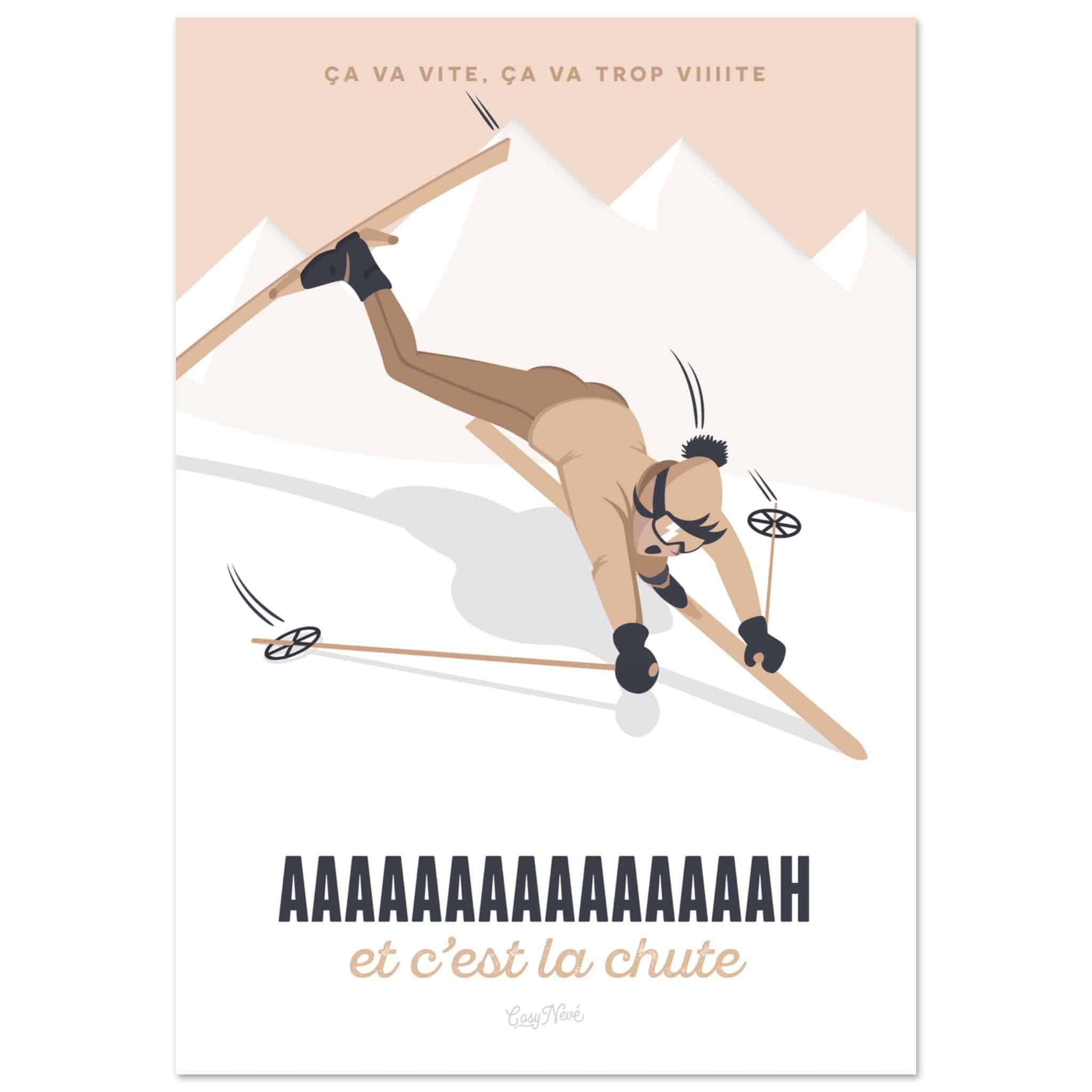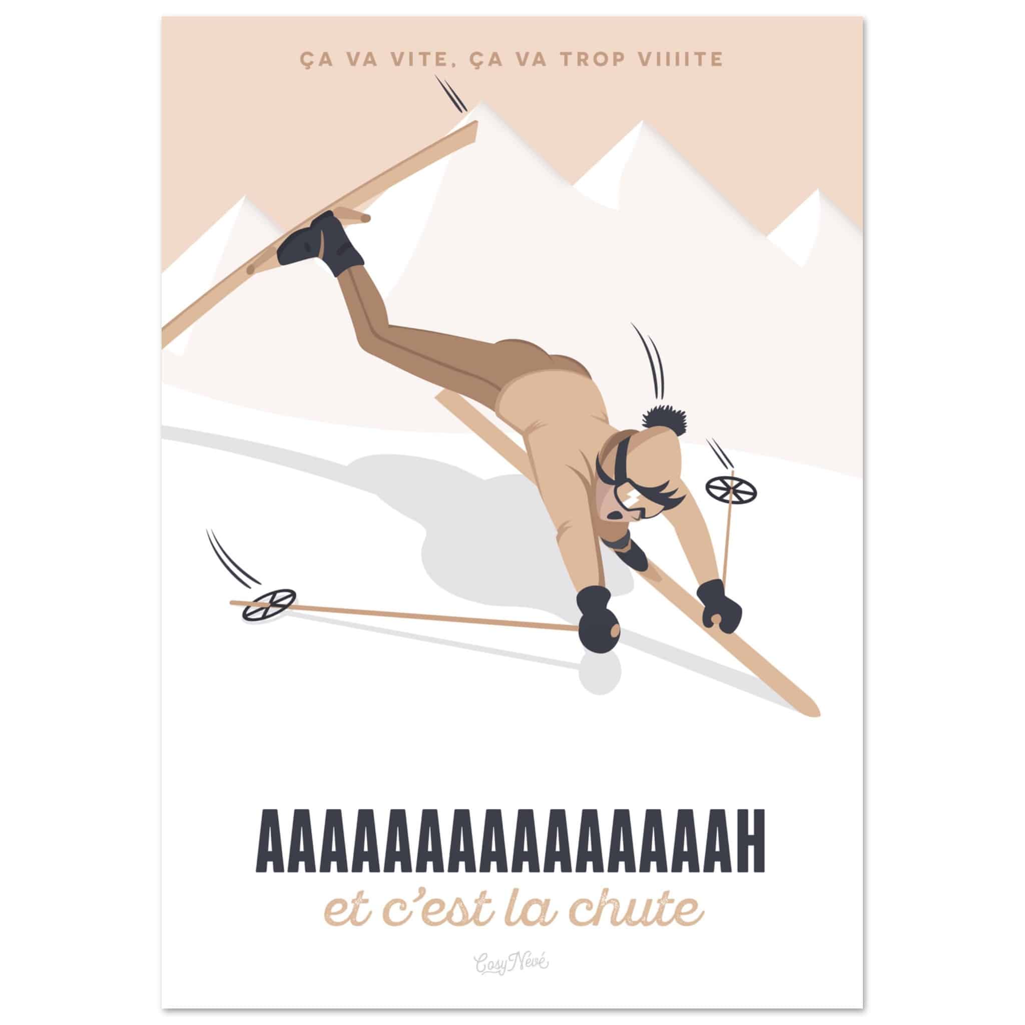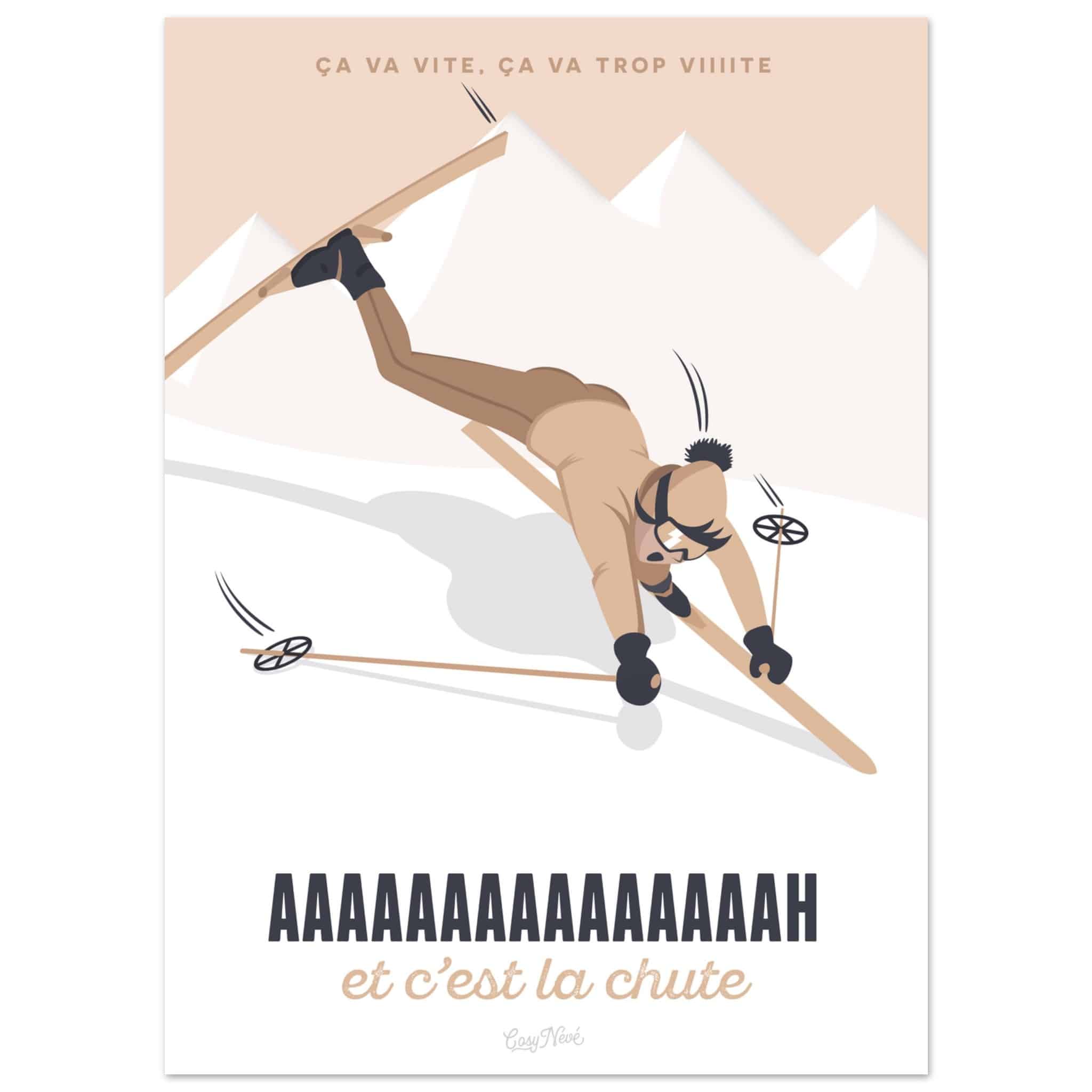 This humorous poster captures the very essence of skiing fails: a skier flying through the air, hand outstretched to soften the landing, skis up high, seconds before diving into the snow.