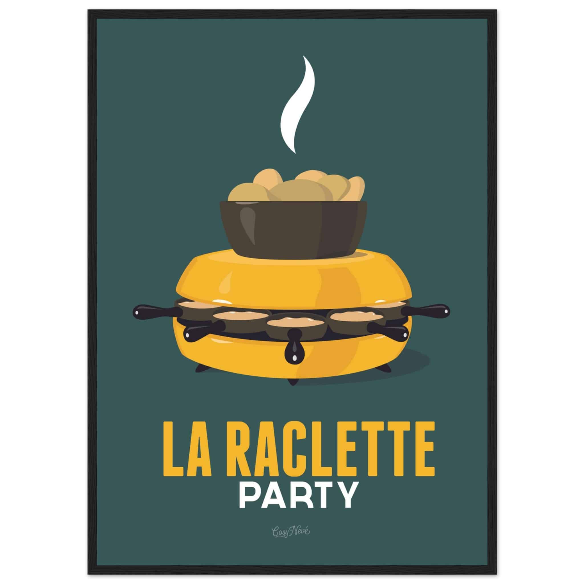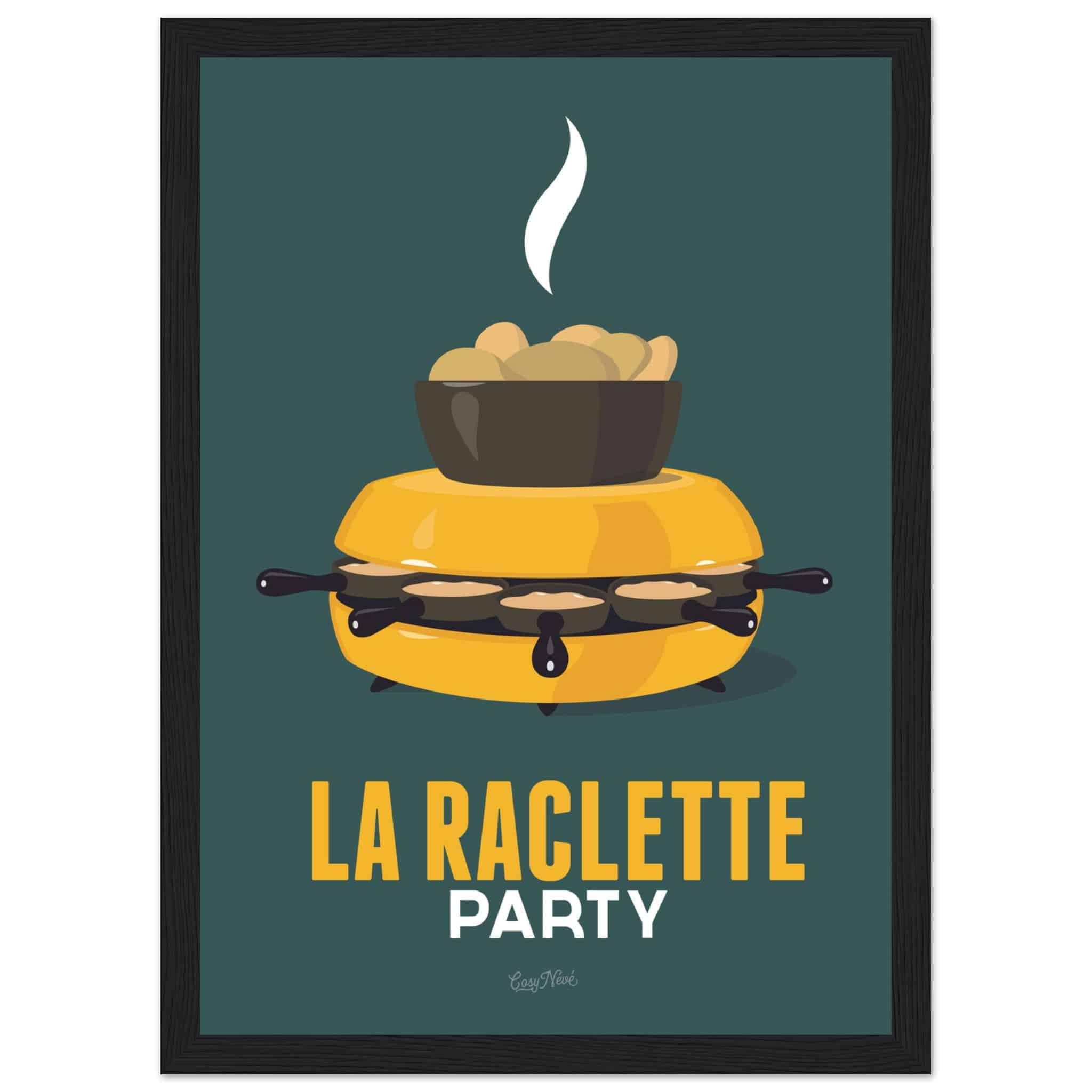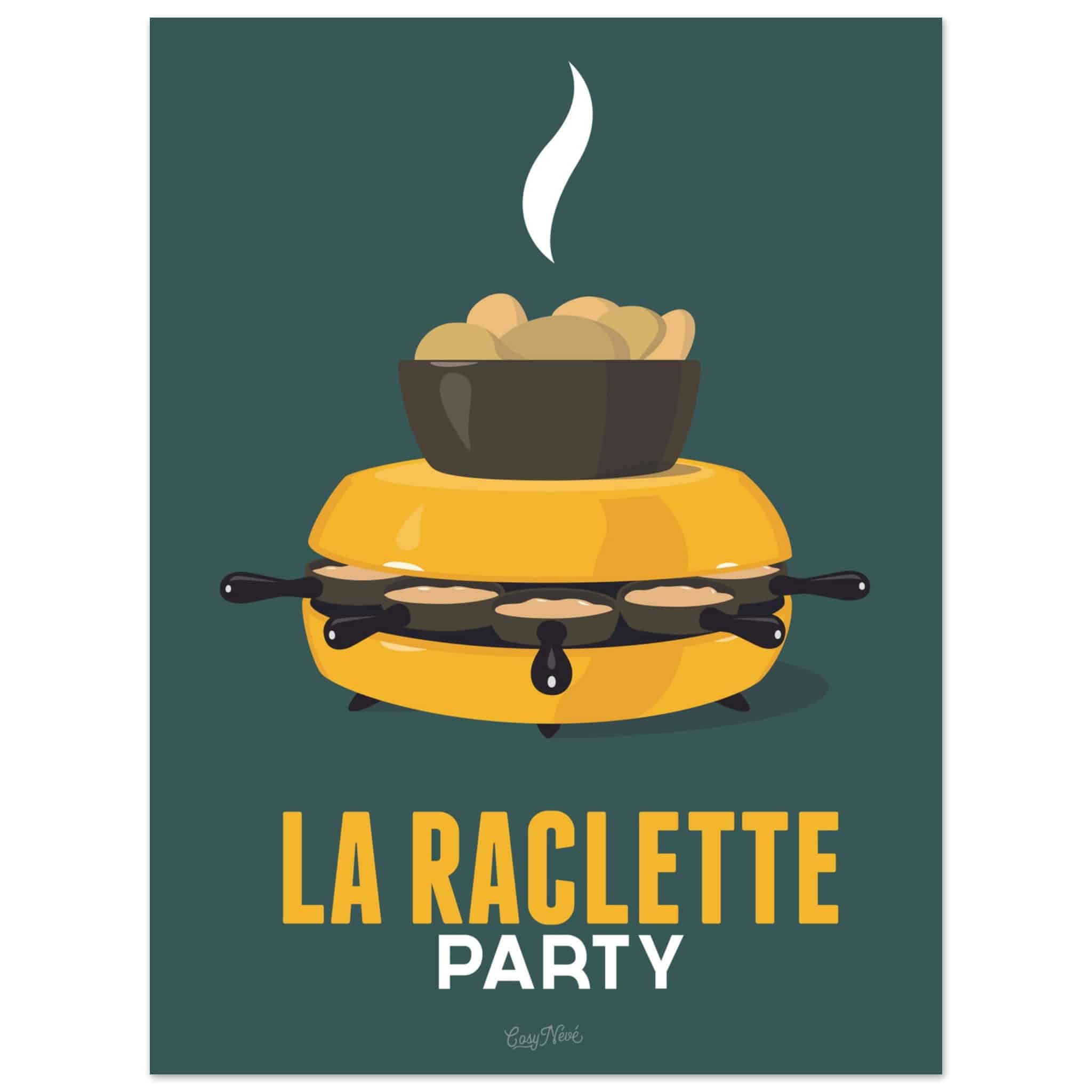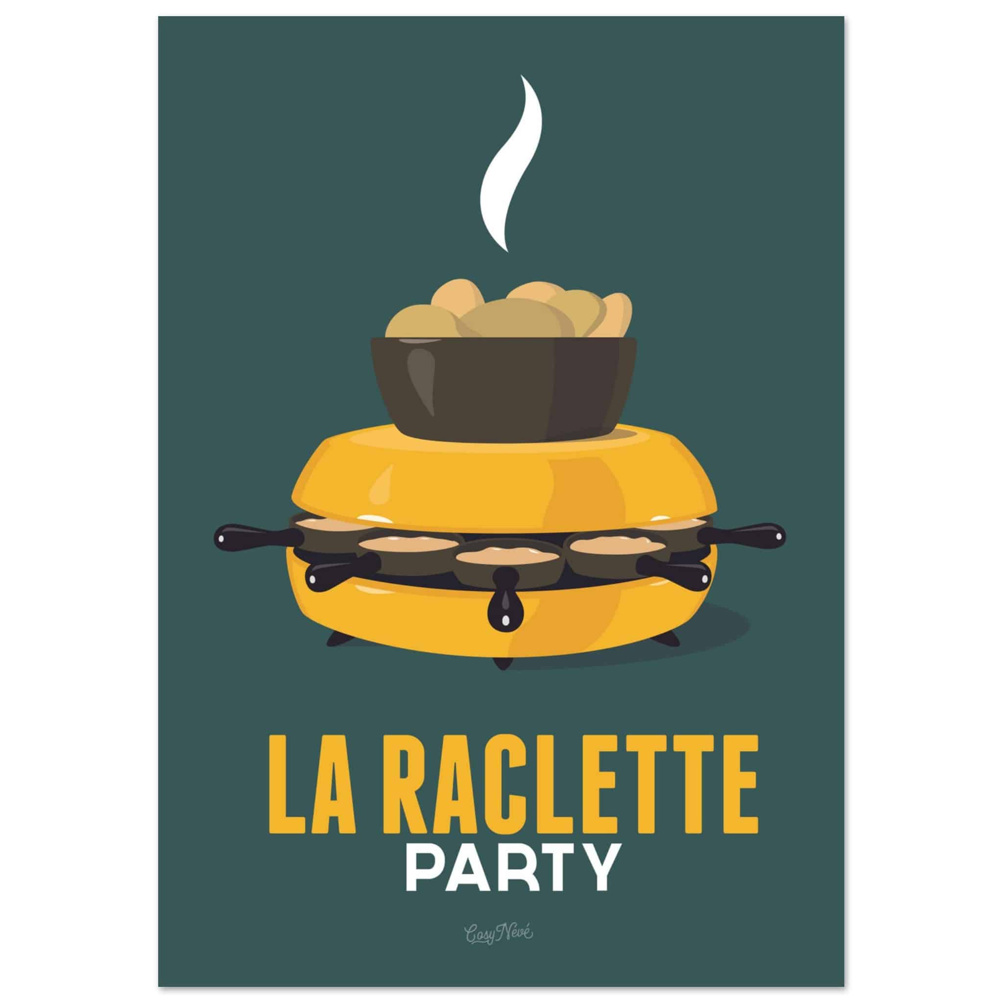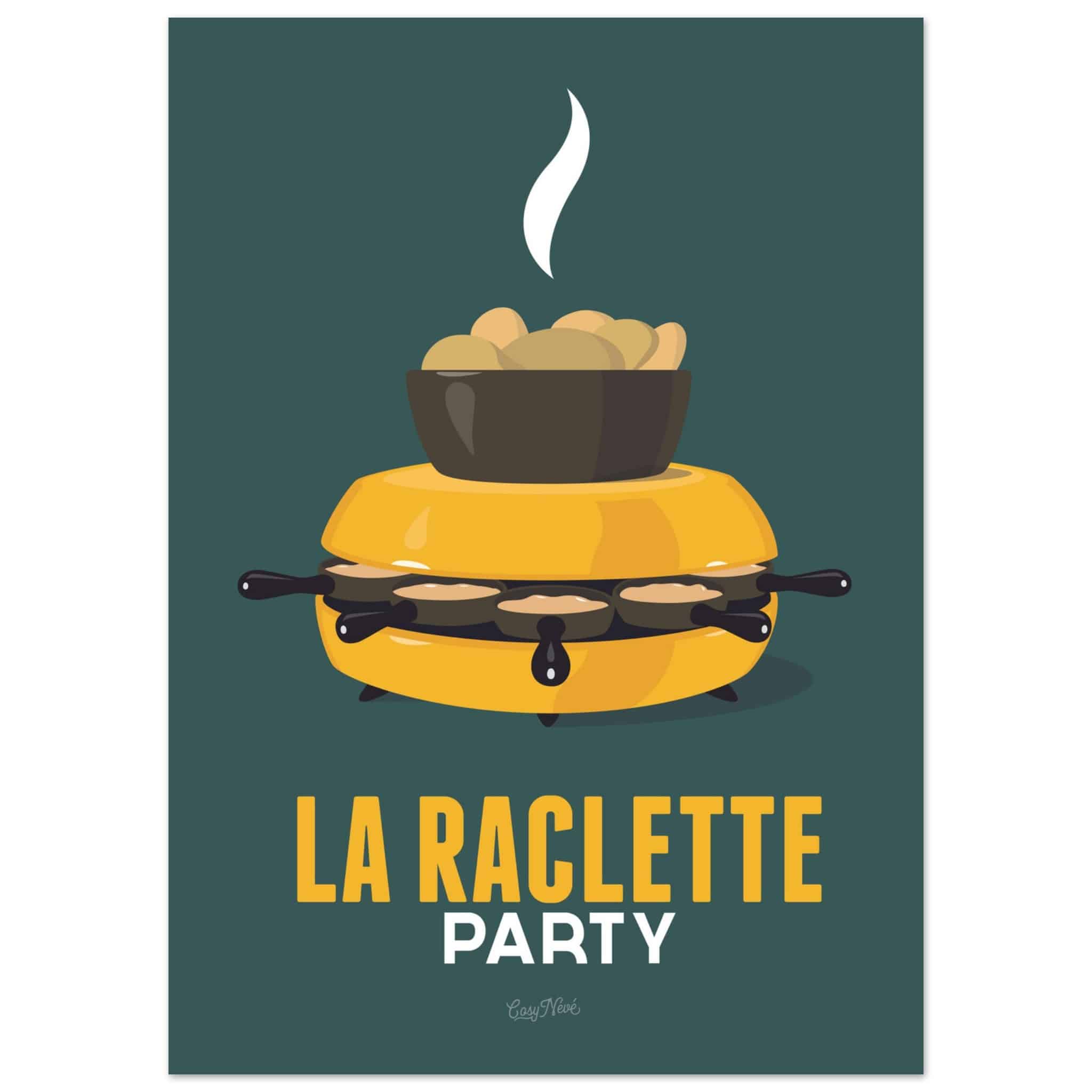 Avec son four à raclette et son fromage en train de fondre, cette affiche rend hommage à un incontournable des soirées hivernales. Que ce soit dans sa version rouge sur fond jaune ou jaune sur fond vert, elle capture toute la convivialité et la gourmandise de ce plat emblématique. Une touche de couleur et de chaleur parfaite pour les amoureux de la montagne… et du fromage !